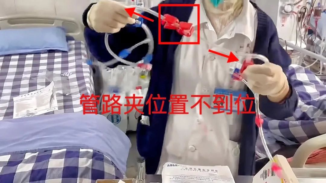 隨后,我觀察護(hù)士們進(jìn)行血液灌流的臨床操作,在操作密閉式連接管時(shí),發(fā)現(xiàn)了一個(gè)使用不當(dāng)?shù)那闆r:密閉式連接管的管路夾位置不正確,透析支路的管路夾未推到兩頭(如圖,管路夾在透析支路正中)。