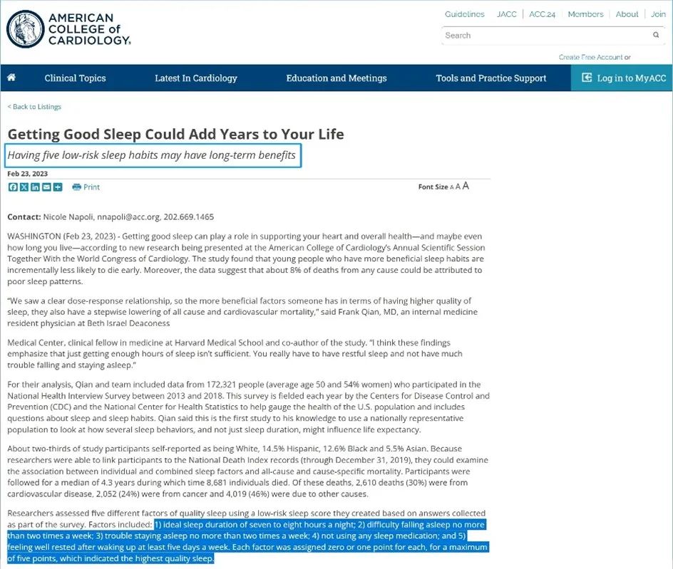 2023年美國心臟病學會(ACC)總結出了5個優(yōu)質(zhì)睡眠的“金標準”——