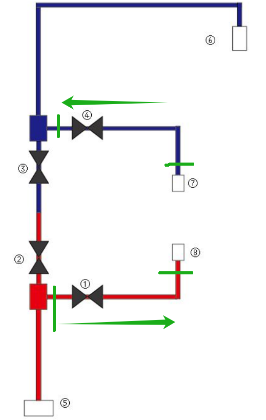 于是小編馬上跟護(hù)士長(zhǎng)及臨床護(hù)士了解原因,在護(hù)士確定操作上機(jī)連接灌流器時(shí)已經(jīng)進(jìn)行了重力預(yù)沖排氣,肉眼觀察未見(jiàn)灌流器內(nèi)有氣泡和空氣存在,排除因灌流器排氣不充分造成;觀察管路,未見(jiàn)有管路銜接不緊密情況;肝素泵管尾端密封帽也旋緊,注射其他藥物時(shí)已排氣,也排除這種可能;繼續(xù)詢問(wèn),護(hù)士反饋密閉式管路預(yù)沖排氣時(shí),灌流器連接支路忘記預(yù)沖排氣了,因透析治療時(shí)沒(méi)有連接灌流器,所以將灌流支路夾①④一直處于關(guān)閉狀態(tài)(如下圖示意),這就導(dǎo)致聯(lián)合治療引血后密閉式管路支路里的空氣會(huì)再次進(jìn)入到灌流器和透析器內(nèi),導(dǎo)致上圖現(xiàn)象發(fā)生,引發(fā)機(jī)器空氣報(bào)警。所以,在透析開(kāi)始后使用密閉式管路連接灌流器模式進(jìn)行治療時(shí),切記在預(yù)沖透析器及管路時(shí)一并將連接灌流器支路的卡扣夾打開(kāi),待充滿鹽水后再將其關(guān)閉,密封帽⑦⑧旋緊待用。