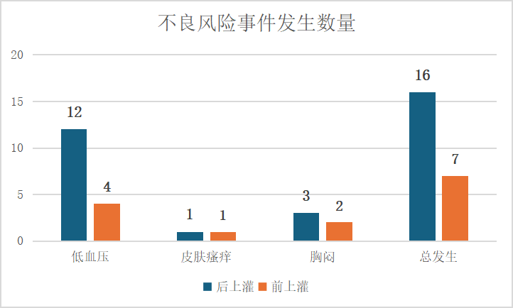 有研究結(jié)果顯示,后上灌會增加不良事件發(fā)生率(見圖3),作者猜測可能是透析治療2h后血容量減少,再行HP治療時(shí)由于血容量相對較低,可能導(dǎo)致濾器凝血,易誘發(fā)機(jī)體低血壓,增加不良事件的發(fā)生。因此,從患者治療安全角度考慮,應(yīng)該選擇前上灌。