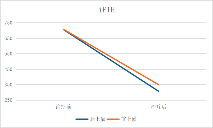 由于后上灌先進(jìn)行2個小時(shí)的透析治療,血液經(jīng)過超濾,處于相對濃縮的狀態(tài),此時(shí)血液內(nèi)中大分子毒素濃度相對較高。此時(shí)再行灌流治療,尿毒癥毒素會被灌流器的吸附顆粒大量吸附,從而提高灌流治療效果。如圖1和圖2,相對于前上灌,后上灌對中大分子毒素iPTH和β2-微球蛋白的清除效果更好。因此,后上灌更有利于清除中大分子毒素。