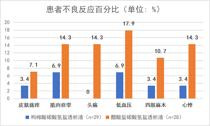 維持性血液透析時(shí),對(duì)醋酸鹽不耐受的患者長(zhǎng)期使用醋酸鹽透析液時(shí)易產(chǎn)生皮膚瘙癢、肌肉痙攣、低血壓、四肢麻木和心悸等不良反應(yīng)。研究表明,使用枸櫞酸碳酸氫鹽透析液時(shí),不良反應(yīng)明顯低于前者。[6]