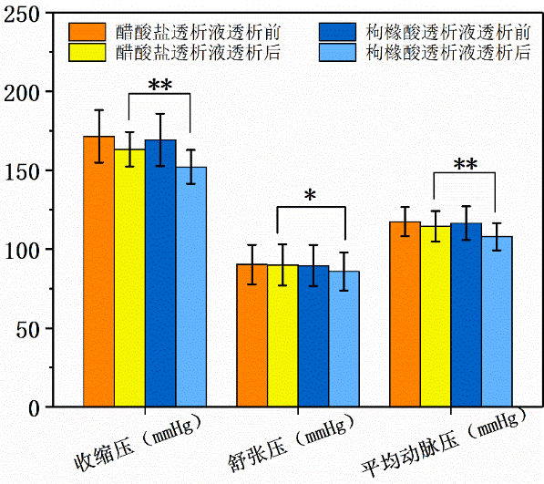 在血液透析過程中離子鈣水平是心血管反應(yīng)的重要決定因素。伴隨血清離子鈣水平的下降,透析患者的心肌收縮力及外周血管阻力降低從而導(dǎo)致血壓下降。徐斌等采用交叉實(shí)驗(yàn)設(shè)計(jì)證明使用枸櫞酸碳酸氫鹽透析液治療的透析患者心血管系統(tǒng)穩(wěn)定性明顯優(yōu)于普通碳酸氫鹽透析液患者,其血壓控制佳(圖3)、高血壓發(fā)生率更低(3.3% vs 20%, P < 0.01)。[5]