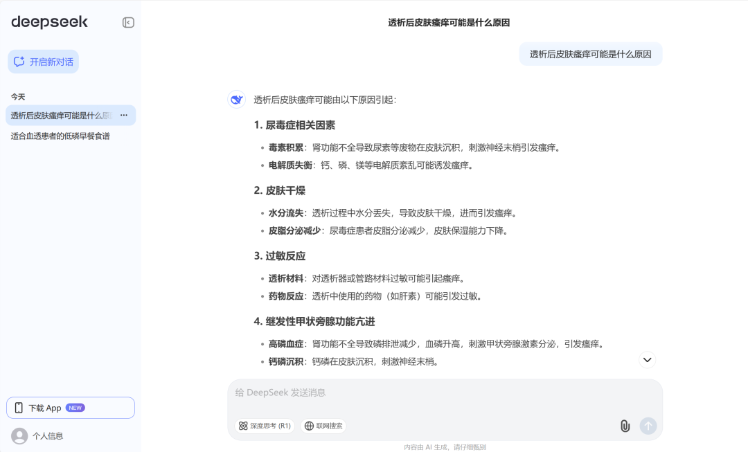 例如,輸入“透析后皮膚瘙癢可能是什么原因”,DeepSeek會列出可能的誘因,如高磷血癥、過敏反應(yīng)等。